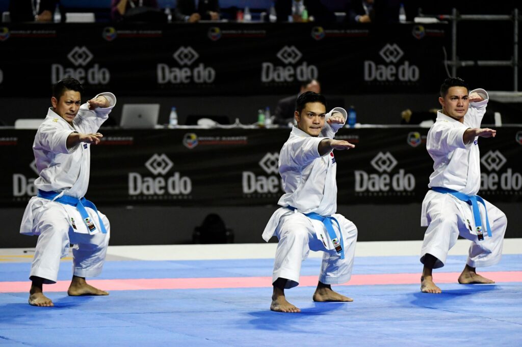Japan’s Arata Kinjo, Ryo Kiyuna and Takuya Uemura compete in the male team Kata final during the 24th Karate World Championships at the WiZink center in Madrid on November 11, 2018. (Photo by JAVIER SORIANO / AFP)